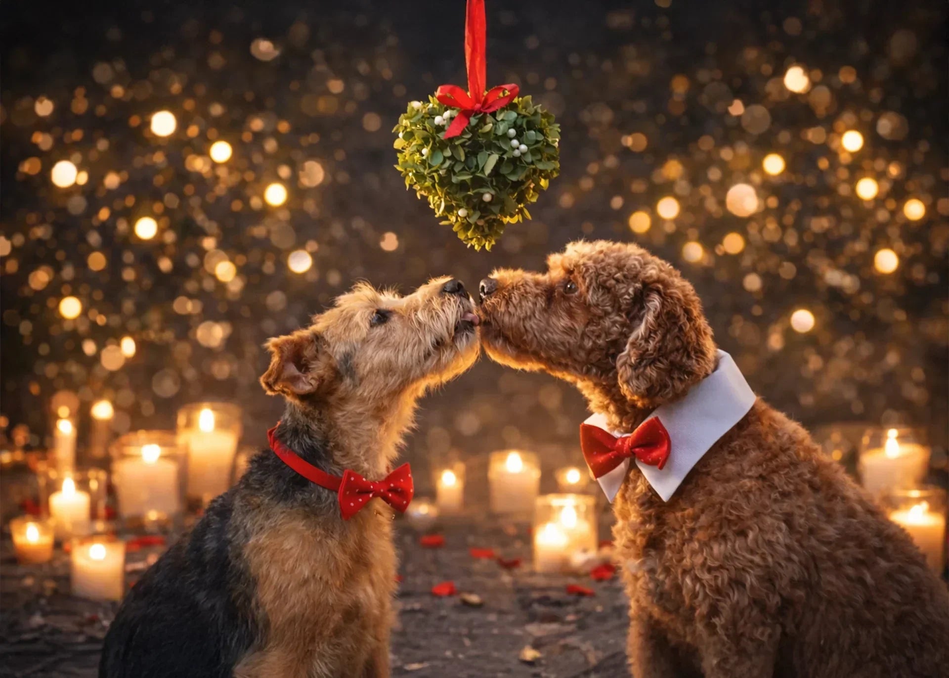 Romantiek tussen honden, maretak met twee hondjes kussend bij kaarslicht Hondenhoek WOEF Boetiek