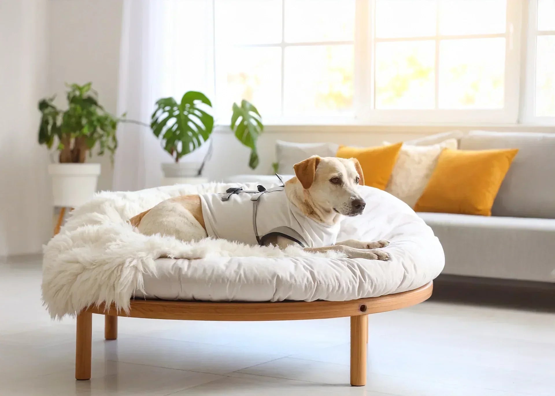 Hond in herstelonesie rust op een orthopedisch hondenbed, ontspannen in warme huiskameromgeving